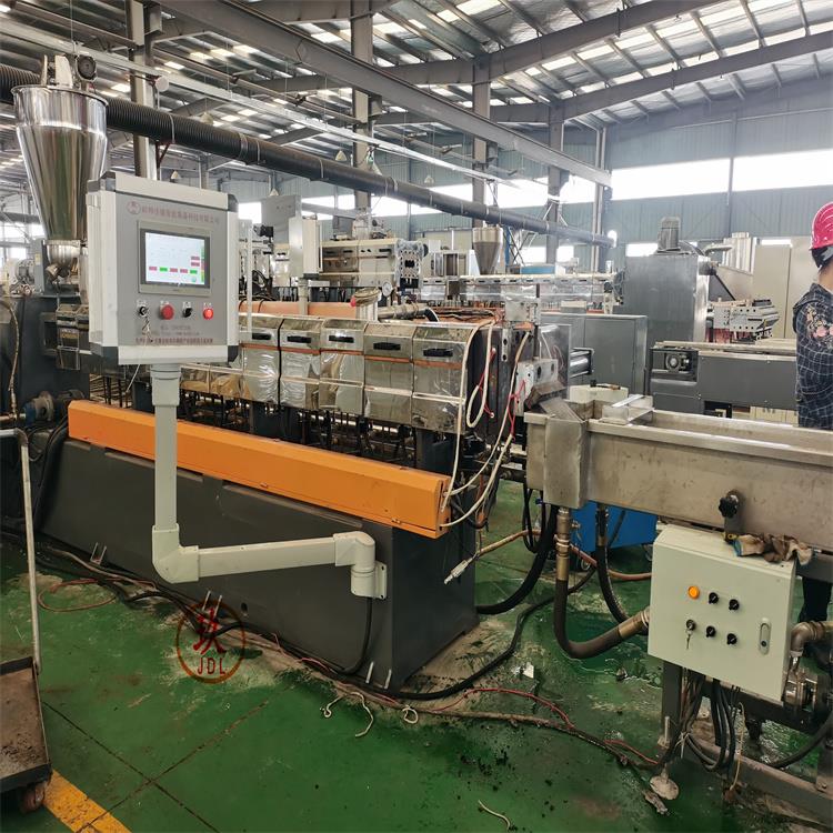 造粒工藝:雙螺桿計量式喂料——-JDL-75B雙螺桿擠出機---——液壓板式換網——拉條機頭-----6米不銹鋼水槽--------吹干機-----龍門切粒機-----主機控制采用:PLC控制