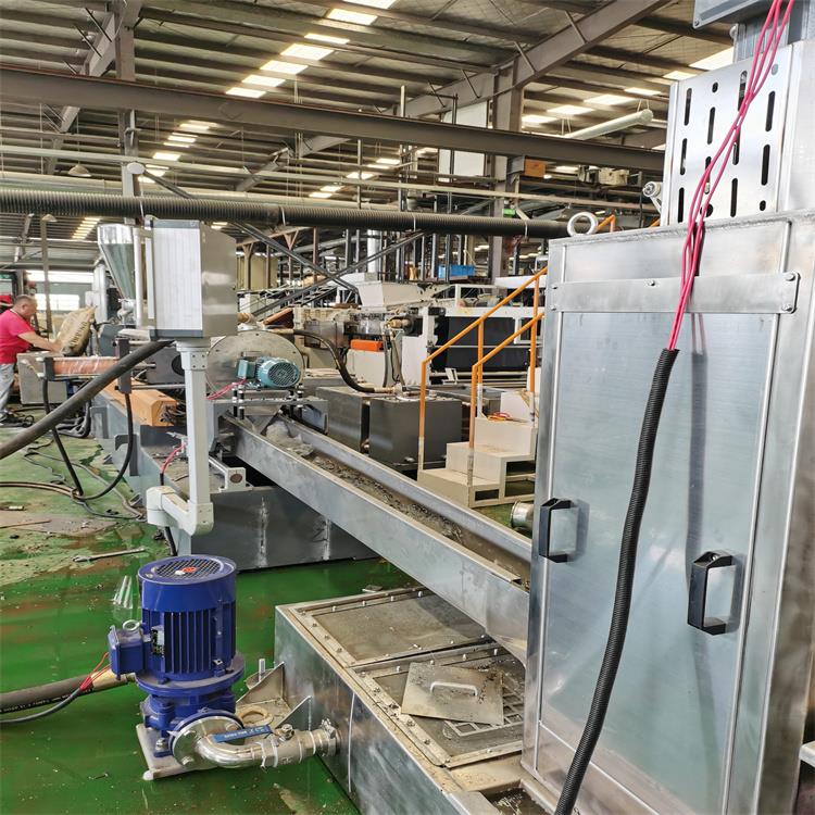 造粒工藝:雙螺桿計(jì)量式喂料——-JDL-75D雙螺桿擠出機(jī)----——液壓板式換網(wǎng)——水環(huán)熱切模頭------水泵-----離心脫水機(jī)------2.5米加長(zhǎng)振動(dòng)篩-----風(fēng)冷成品料倉(cāng)----- -主機(jī)采用:PLC控制
