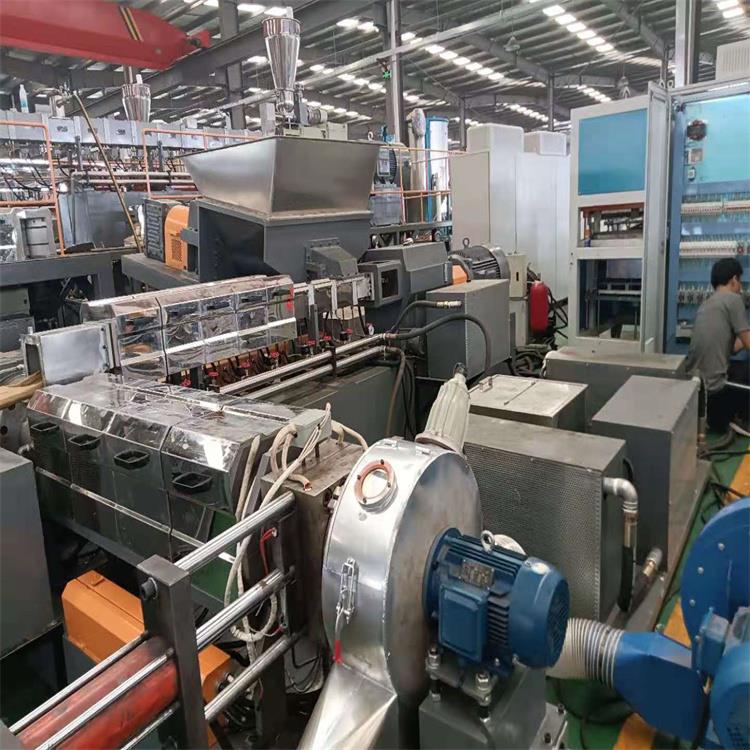 雙階電纜料造粒機_環(huán)保型電纜料造粒設(shè)備_低煙無鹵電纜料造粒機:密煉機——自動提升機——推拉式錐雙喂料機——雙螺桿擠出機——單螺桿擠出機——液壓板式自動換網(wǎng)——風(fēng)冷模面熱切造粒輔機——一級旋風(fēng)分離器——二級旋風(fēng)分離器----風(fēng)冷振動篩(2.5m) ——風(fēng)吹料倉一套